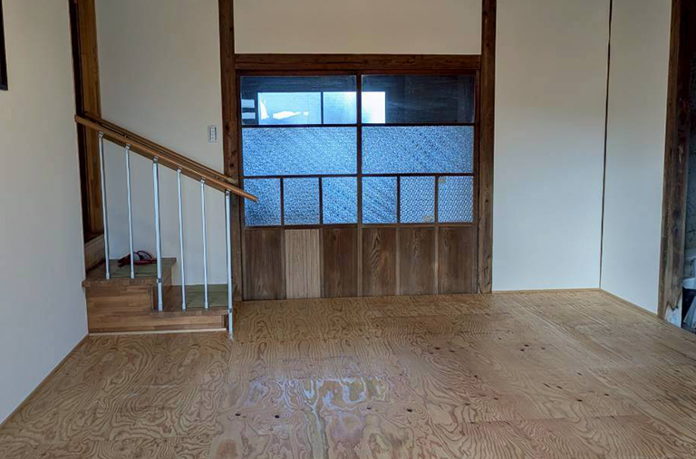 津島市にて、築約80年の住宅にある「離れ」の未利用空間を、多目的な趣味室へリフォームしました。もともとは長年使われていない倉庫状態。古いアルミ扉は立て付けが悪く、内部も荒れた状態でした。